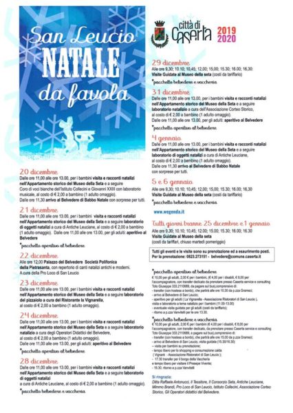 Dal 20 al 24 dicembre, e 28 e 31 dicembre e il 4 gennaio 2020 a San Leucio ci sara “Un Natale da Favola” in piazza Trattoria con un Presepe realizzato dal Liceo Artistico di San Leucio.