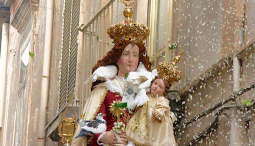 Ma il giorno della festa vera e propria è quello della domenica in Albis, l’ottava di Pasqua. In questo giorno, da secoli, la Vergine lascia il Santuario alle 9.00 in punto per avviarsi, accompagnata dai Confratelli, in una lunghissima processione per le strade della città, accolta ovunque con drappi, fiori, coriandoli, canti e danze popolari e dalle caratteristiche offerte di galline, piccioni e animali da cortile, amorevolmente custoditi nel pollaio dell’Arciconfraternita. Un tripudio di fede e folklore che certamente costituisce un momento di grande partecipazione e suggestione collettiva.