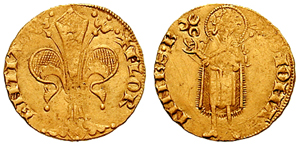 Fiorino d’oro. La parte dritta è rappresentata dal Giglio; mentre il rovescio da San Giovanni, patrono di Firenze.