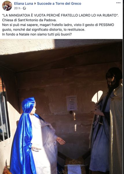 Chiaro il riferimento al Cantico delle Creature di San Francesco. Ma i fedeli non ci stanno e tramite social lanciano appelli a chiunque avesse visto qualcosa. Tantissime le foto della mangiatoia vuota. Questo il post denuncia condiviso nel gruppo ‘Succede a Torre del Greco’.