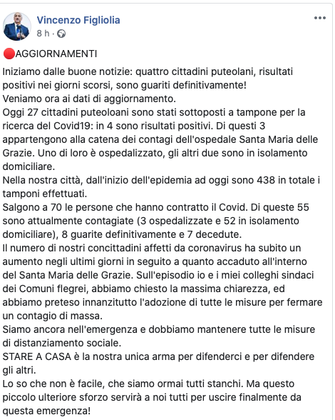 “Il numero di nostri concittadini affetti da coronavirus ha subito un aumento negli ultimi giorni in seguito a quanto accaduto all’interno del Santa Maria delle Grazie. Sull’episodio io e i miei colleghi sindaci dei Comuni flegrei abbiamo chiesto la massima chiarezza, ed abbiamo preteso innanzitutto l’adozione di tutte le misure per fermare un contagio di massa”.