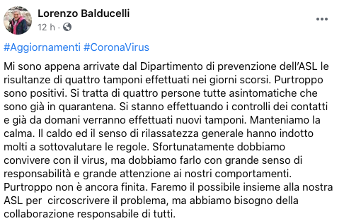 “Mi sono appena arrivate dal Dipartimento di prevenzione dell’Asl le risultanze di quattro tamponi effettuati nei giorni scorsi. Purtroppo sono positivi. Si tratta di quattro persone tutte asintomatiche che sono già in quarantena. Si stanno effettuando i controlli dei contatti e già da domani verranno effettuati nuovi tamponi. Manteniamo la calma. Il caldo e il senso di rilassatezza generale hanno indotto molti a sottovalutare le regole. Sfortunatamente dobbiamo convivere con il virus, ma dobbiamo farlo con grande senso di responsabilità e grande attenzione ai nostri comportamenti. Purtroppo non è ancora finita. Faremo il possibile insieme alla nostra Asl per circoscrivere il problema, ma abbiamo bisogno della collaborazione responsabile di tutti”.