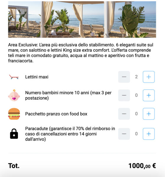 Ma ecco cosa è incluso con il nostro caro gazebo salentino: oltre alla postazione nell’area più esclusiva dello stabilimento, l’ospite può usufruire di salottino con divanetti di vimini e lettini king size. I teli, si legge sul sito al momento della prenotazione, sono in “comodato gratuito”. Vengono inoltre forniti acqua al mattino ed aperitivo con frutta e vino franciacorta. Tra le opzioni è possibile il pacchetto pranzo (30 euro ognuno) ed un “paracute”, ossia un’assicurazione che al costo di 69 euro garantisce un rimborso del 70% in caso di cancellazione entro 14 giorni.