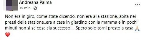 Alcuni familiari hanno spiegato che la ragazza, che abita con la famiglia nei pressi della stazione, era in casa quando, in poco tempo, avrebbe fatto perdere le sue tracce. “Non era in giro, non era alla stazione, era a casa in giardino con la mamma e in pochi minuti non si sa cosa sia successo. Spero solo torni presto” – ha sottolineato la cugina che ha lanciato l’allarme sui social. Dal momento della scomparsa non ci sono stati aggiornamenti.