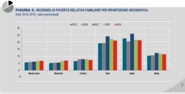 Guardando il quinto grafico, presente all’interno del documento, sono visibilmente notevoli le differenze tra Nord, Centro, Sud e Isole. In esso si legge che: “Rispetto al 2018 la situazione risulta sostanzialmente stabile. A Nord l’incidenza della povertà relativa si attesta a 6,8 % mentre nel Mezzogiorno è pari al 21,1%”.