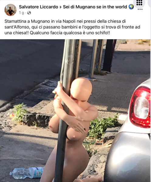 A postare per primo la foto è stato Salvatore Liccardo nel gruppo Facebook ‘Sei di Mugnano se in the world’ che camminando per le strade della città si era imbattuto in questo sexy toys. A prima vista infatti la bambola poteva sembrare un manichino ma alcune fattezze (come il seno sproporzionato rispetto al resto del corpo) hanno fatto subito capire che si trattava di una real doll, un giocattolo sessuale con un corpo in silicone che riproduce le fattezze di una donna persino al tatto. Il post in pochi minuti è diventato virale: