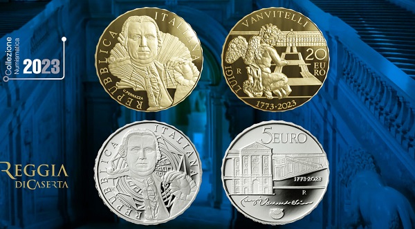 Le prime, “250° Anniversario della scomparsa di Luigi Vanvitelli”, in due versioni 5 euro in argento e 20 euro in oro, sul dritto presenta il primo piano di Vanvitelli tratto da un dipinto conservato all’Accademia di San Luca. Sullo sfondo la celebre “conchiglia” del Maestro, tratto distintivo di molte sue opere, nella versione in oro. Un dettaglio del pavimento del Vestibolo superiore della Reggia di Caserta, nella versione in argento. Sul rovescio, in oro, c’è il primo piano di un amorino della Fontana di Venere e Adone, lungo la via d’acqua del Parco Reale della Reggia di Caserta. Sullo sfondo la facciata interna del Palazzo Reale vista dal culmine del Museo verde. Nel giro trova posto la scritta “Luigi Vanvitelli” e in esergo le date “1773-2023” a ricordare la ricorrenza dei 250 anni. Sul rovescio della versione in argento la facciata esterna della Reggia di Caserta, un dettaglio dello Scalone Reale e la firma autografa di Vanvitelli.