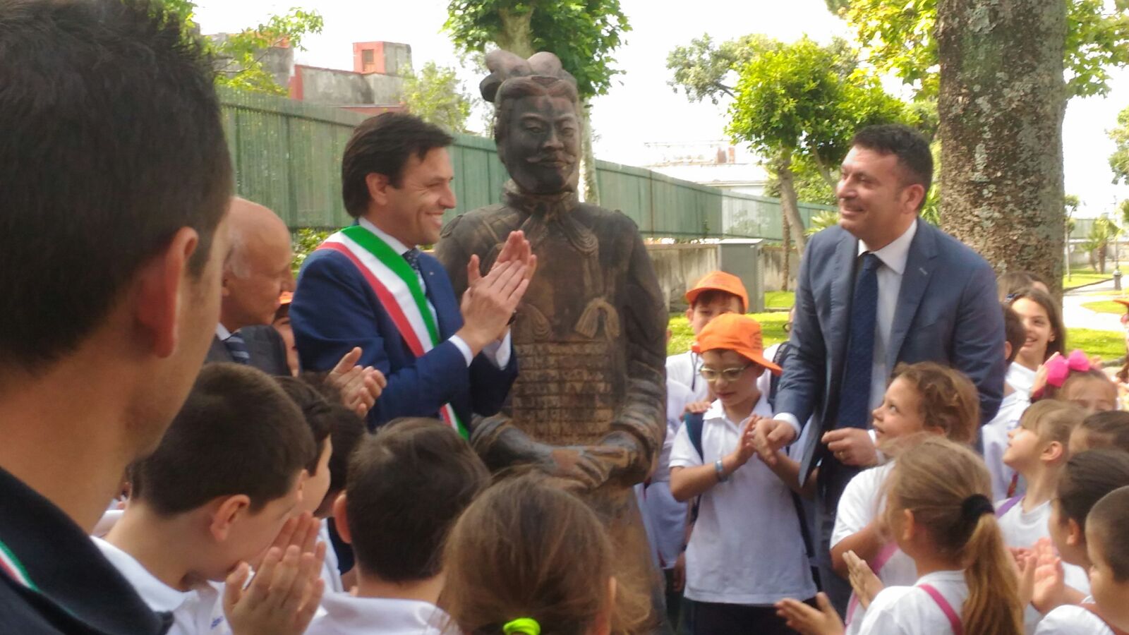 È stata scoperta oggi nel Palazzo di Città una statua raffigurante un antico dignitario dell’esercito cinese proveniente da Xi’An, una delle metropoli più popolose della Cina. La statua, donata dal Governatore della Provincia dello Shaanxi al sindaco di Ercolano Ciro Buonajuto,è stata posizionata all’ingresso della Villa Comunale del Municipio. Assieme al primo cittadino ed al presidente del Consiglio comunale Luigi Simeone, hanno preso parte alla cerimonia il presidente dell’Accademia Ercolanese Aniello De Rosa, promotore dell’iniziativa, il dirigente del Centro Italiano Ricerche Aerospaziali Carlo Russo, una rappresentanza di studenti dell’istituto superiore “Tilgher” e un centinaio di bambini delle scuole elementari cittadini.