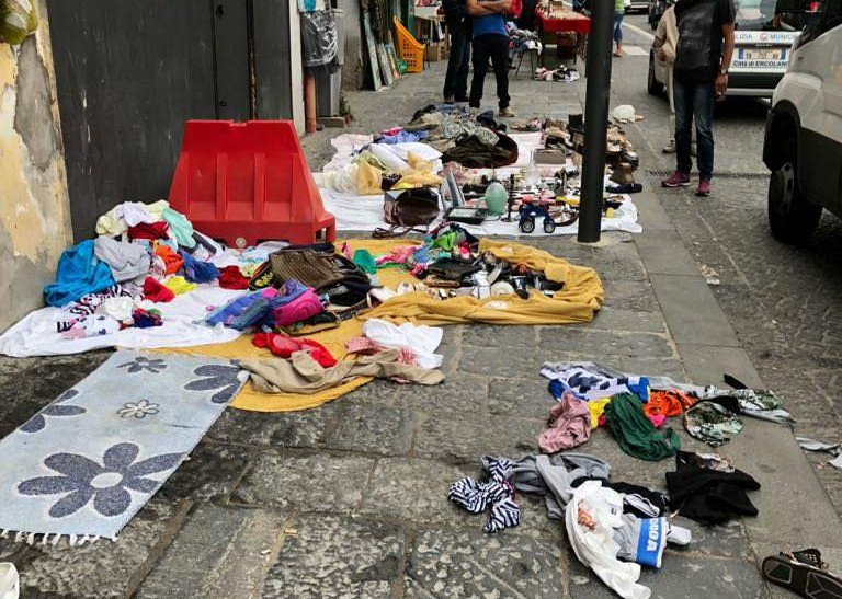 Nuovo blitz della Polizia Municipale in via Pugliano a Ercolano dove questa mattina sono stati sequestrati oltre cinque quintali di indumenti usati ed oggettistica di ignota provenienza venduta senza alcun titolo da ambulanti abusivi.