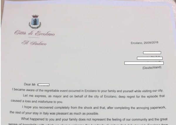 ERCOLANO – A seguito del furto subito sabato scorso da una famiglia di turisti tedeschi, all’esterno degli Scavi di Ercolano, il sindaco li invita, come promesso, ospitandoli gratuitamente in città. La lettera con l’invito ufficiale è stata spedita questa mattina proprio dal primo cittadino Ciro Buonajuto. La famiglia, originaria della Sassonia, è stata invitata a trascorrere un weekend a Ercolano a spese della città per una nuova visita agli Scavi e per un’escursione sul Vesuvio. La volontà di ospitare i turisti derubati, manifestata già dalle prime ore successive all’increscioso episodio, ha aperto una gara di solidarietà tra le diverse strutture ricettive (Hotel e B&B) della cittadina.