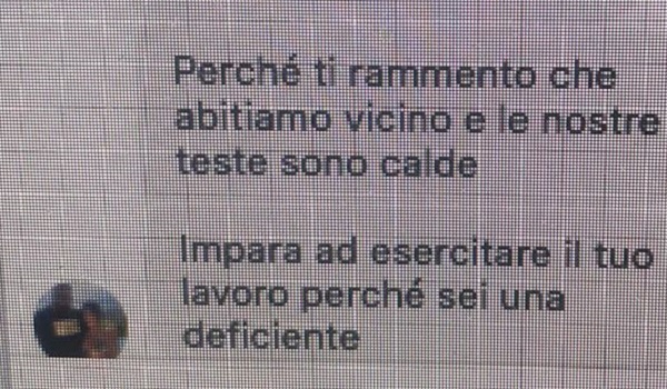 Accusata inoltre di non svolgere in maniera idonea il proprio lavoro, è stata anche etichettata come deficiente. Queste le parole in chat “Impara ad esercitare il tuo lavoro perché sei una deficiente“.