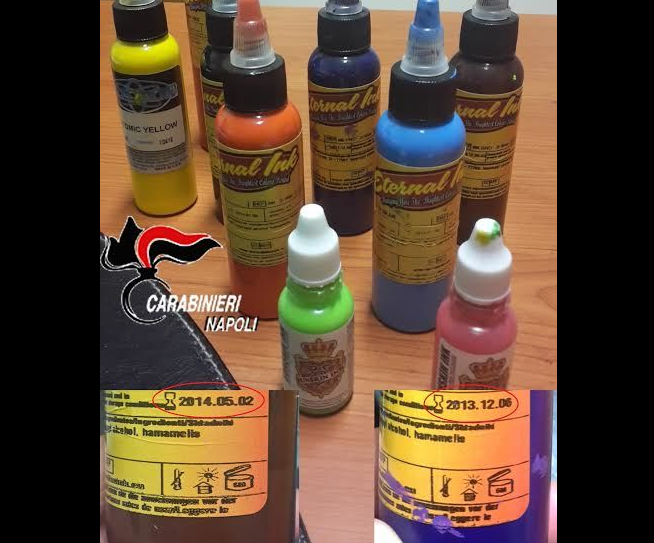 L’irregolarità è stata riscontrata dal personale dell’Asl durante un controllo: sui flaconi in questione, come si vede dall’immagine fornita dai carabinieri, sono riportate le date di scadenza 02 maggio 2014 e 06 dicembre 2016. Non è detto, in ogni caso, che gli inchiostri siano stati usati per realizzare tatuaggi dopo la scadenza.