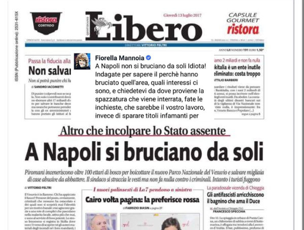 La Mannoia ha subito provveduto a rispondere alle offese ed a specificare che il suo commento era rivolto ai piromani, riconfermando il suo supporto al nostro popolo. Poche ore fa, la cantante meridionalista ha aggiunto un altro commento al suo post. Nelle nuove dichiarazioni attacca espressamente l’articolo di Libero di questa mattina, intitolato “A Napoli si bruciano da soli”.