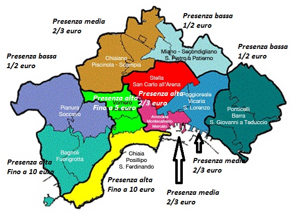 Fascia A drogati e nullafacenti 1.000,00/2.000,00 euro al mese (il 30% va la clan che assegna la strada di competenza); Fascia B parcheggiatori con storica attività territoriale 2.000,00/4.000,00 euro al mese (il 40% va al clan); Fascia C parcheggiatore nominato dal clan per dargli rendita economica (4.000,00/6.000,00 euro al mese e resta tutto a lui l’importo).