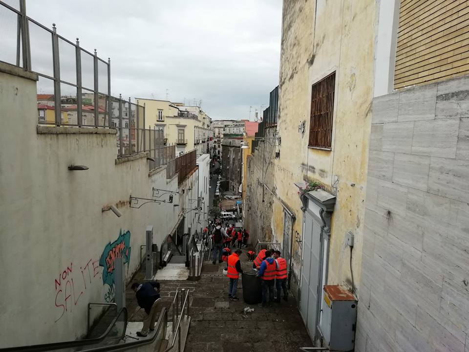Questa mattina un gruppo di disoccupati ha eseguito un intervento di riqualificazione dello scalone adiacenti la Stazione di Montesanto di proprietà dell’EAV, chiuse da anni ai più. L’iniziativa, ad opera degli iscritti al “Movimento di Lotta e disoccupati 7 novembre” è nata anche per denunciare “lo stato di degrado del sito sul quale si sono sprecati milioni di euro pubblici senza mai restituire ai cittadini l’agibilità e l’impianto di scale mobili allestito da più di sette anni“, viene spiegato in un comunicato.