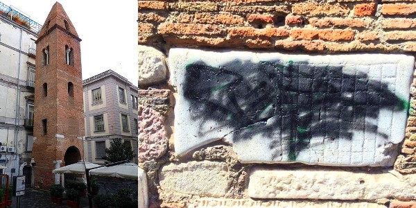 Nella parte inferiore del campanile si trova, sempre in marmo, la scacchiera del gioco romano ludus latrunculorum, il gioco dei soldati, predecessore del gioco della dama e dell’Otello. Questo reperto, tuttavia, è coperto da una grossa macchia di inchiostro nero di bomboletta, un vero sfregio a un monumento talmente bello e ricco di storia.