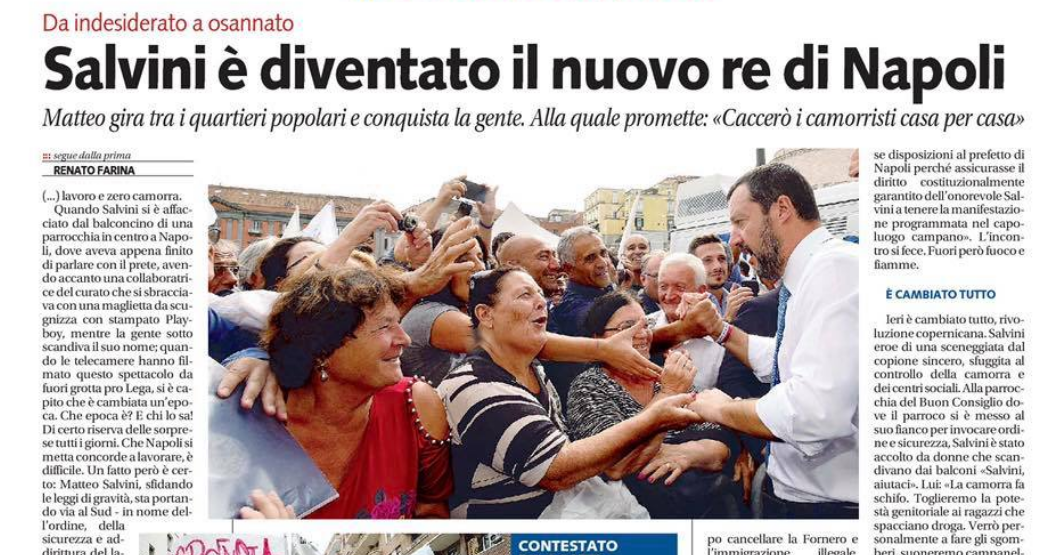 “Da indesiderato a osannato – si legge nel pezzo – Gira fra i quartieri e conquista la gente […] Che epoca è? E chi lo sa! […] Matteo Salvini, sfidando le leggi di gravità, sta portando via al Sud – in nome dell’ordine, della sicurezza e addirittura del lavoro – consenso a Giggino Di Maio e soprattutto a ‘o sindaco de Magistris, appesi al reddito di cittadinanza (il primo) e al fancazzismo festoso di Masaniello (il secondo)“.