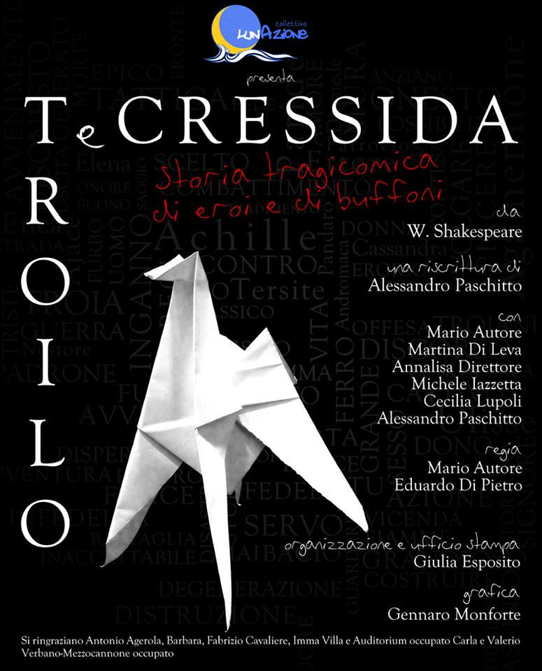 Nella presentazione di questa rubrica, “L’illusione del cinema“, vi avevo avvertito che qualche volta ci poteva essere una sorpresa, ed infatti oggi è così, perché parlerò di una rappresentazione teatrale: “Troilo e Cressida. Storia tragicomica di eroi e buffoni”, cui ho assistito ieri presso Diffusione Teatro a Torre Annunziata. L’opera è una riscrittura di Alessandro Paschitto, con la regia di Mario Autore ed Eduardo Di Pietro, della tragicommedia di William Shakespeare “Troilo e Cressida”, che parla della storia d’amore tra Troilo, fratello di Ettore, e Cressida, sullo sfondo della guerra di Troia. L’illusione, qui, è presente in varie declinazioni: l’illusione di capire la vita, indirizzarla, di comprendere l’essere umano e le sue azioni, di poter scrivere o riscrivere il destino. Si tratta inoltre di uno spettacolo prodotto dal basso, a cura del Collettivo LunAzione, grazie ai co-produttori che hanno acquistato delle quote.