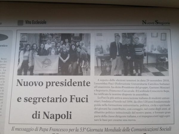 Notizia della nomina del nuovo presidente e segretario Fuci di Napoli dal settimanale Nuova Stagione. Fonte: https://www.facebook.com/FuciNapoli/photos/a.1468948146710894/2256988881240146/?type=3&theater