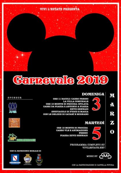 Anche Bacoli e Monte di Procida si preparano per un super Carnevale 2019. Organizzato dall’Associazione Vivi L’Estate, tema della festa sarà Topolino che quest’anno compie 90 anni. Due giorni, domenica 3 marzo e martedì 5 marzo 2019, sfileranno bellissimi carri allegorici dedicati al topo più famoso e amato al mondo.