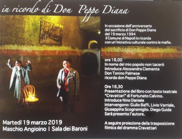 Come riporta il sito del Comune di Napoli, si è deciso di ricordarlo con un’iniziativa contro le mafie. L’evento comincerà alle ore 18.00 con ‘In nome del mio popolo non tacerò‘ con l’introduzione di Alessandra Clemente e l’intervento di Don Tonino Palmese che ricorderà Don Peppe Diana.