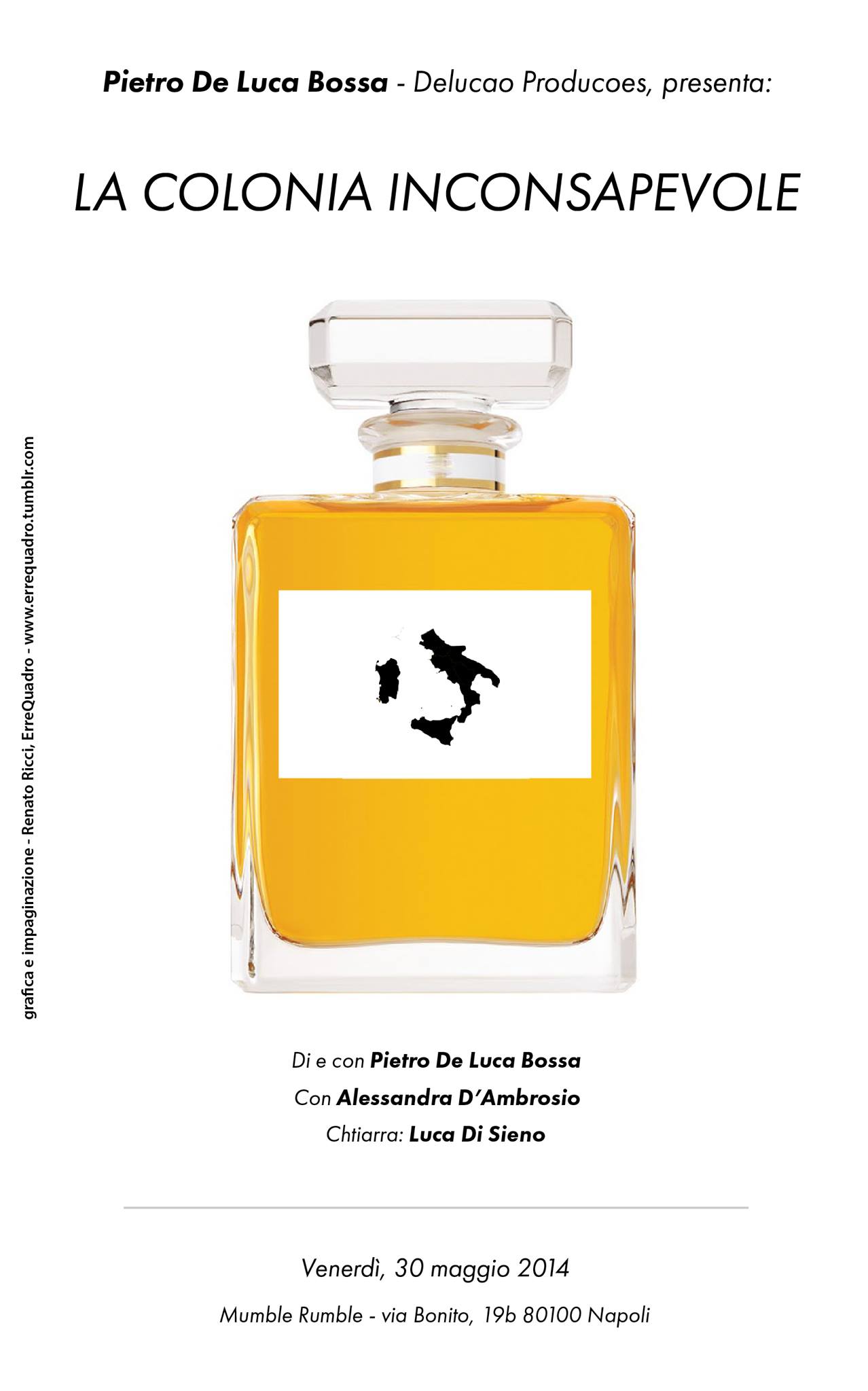 Questa sera al Mumble Rumble di Napoli (via bonito 19b) andrà in scena lo spettacolo di Pietro de Luca Bossa intitolato “La Colonia Inconsapevole“, scritto e interpretato da lui stesso e il cui obiettivo è di capire e far capire come il Sud Italia sia continuamente oppresso.