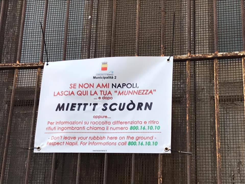Lo slogan dell’iniziativa della seconda municipalità, infatti, è il seguente: “Se non ami Napoli, lascia qui la tua “munnezza”…e dopo MIETT’T SCUÒRN oppure… per informazioni su raccolta differenziata e ritiro rifiuti ingombranti chiama il numero 800.16.10.10“ con tanto di indicazione del numero verde per le informazioni in inglese.