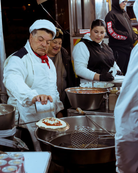 Faceva freddo, sì, ma l’atmosfera si è riscaldata in fretta insieme alle pizze fritte d”o Ricciulillo, autentica istituzione partenopea. Pomodoro, ricotta, formaggio, cicoli e tanto pepe per una completa: è bastato che la prima fosse immersa nell’olio bollente perché tante persone si mettessero in fila per mangiare la pizza del popolo, ‘a pizza ‘e Napule come precisa a squarciagola don Aniello, da molti considerato ‘o rre d”e fritture. Non solo pizza fritta: pere e ‘o musso, pizze a portafoglio, panini con la porchetta, spighe, ‘o spassatiempo e tanto altro perché i napoletani lo sanno bene che a panza chiena si ragiona meglio.