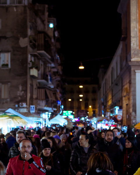 Mentre al suo interno si recitano rosari e messe per la Madonna Bruna, come sempre la Basilica del Carmine assiste e protegge chi aspetta la notte del 5 Gennaio per raccogliere qualche soldo in più da portare a casa. Se la maggior parte delle bancarelle è perfettamente in regola, c’è anche qualcuna che lo è di meno, che si arrangia, ma non importa: a Napoli c’è sempre posto a tavola per un ospite in più, chi conosce davvero le zone più popolari lo sa bene e sa bene che spesso dietro chi “se la cava” ci sono tragedie, disagi, padri di famiglia che preferiscono rischiare ‘o verbale anziché la libertà. Nel mondo ideale non dovrebbe funzionare così, ma è noto che a parte i nostri profili social, colmi di belle immagini e belle parole, la perfezione non appartiene a questo mondo e neanche a Napoli, città di luci e ombre, come i dipinti di Caravaggio.