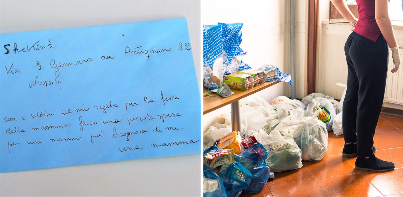 Un’altra storia riguarda una signora che, invece, ha utilizzato i soldi del regalo per la Festa della Mamma per donare una spesa. Il suo bigliettino recita: “Con i soldini del mio regalo per la Festa della Mamma faccio una piccola spesa per una mamma più bisognosa di me. Una mamma”.