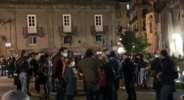Qualche assembramento di troppo a Napoli, almeno a giudicare dalle immagini che sono state immortalate questa sera ed inviate a VesuvioLive da una lettrice. Siamo in zona Piazza San Domenico, una delle più frequentate dalla cosiddetta movida del centro storico partenopeo.