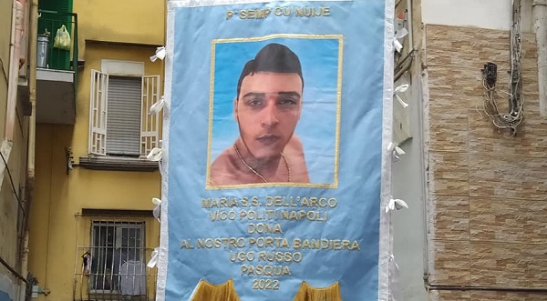 Un’associazione l’ha dedicato “al nostro porta bandiera Ugo Russo“, il 15enne ucciso a Santa Lucia da un carabiniere fuori servizio durante un tentativo di rapina. A denunciare quanto accaduto è stato un consigliere di San Giorgio a Cremano, Ciro Di Giacomo, che la sera di Pasqua era a Napoli e che ha visto la processione.