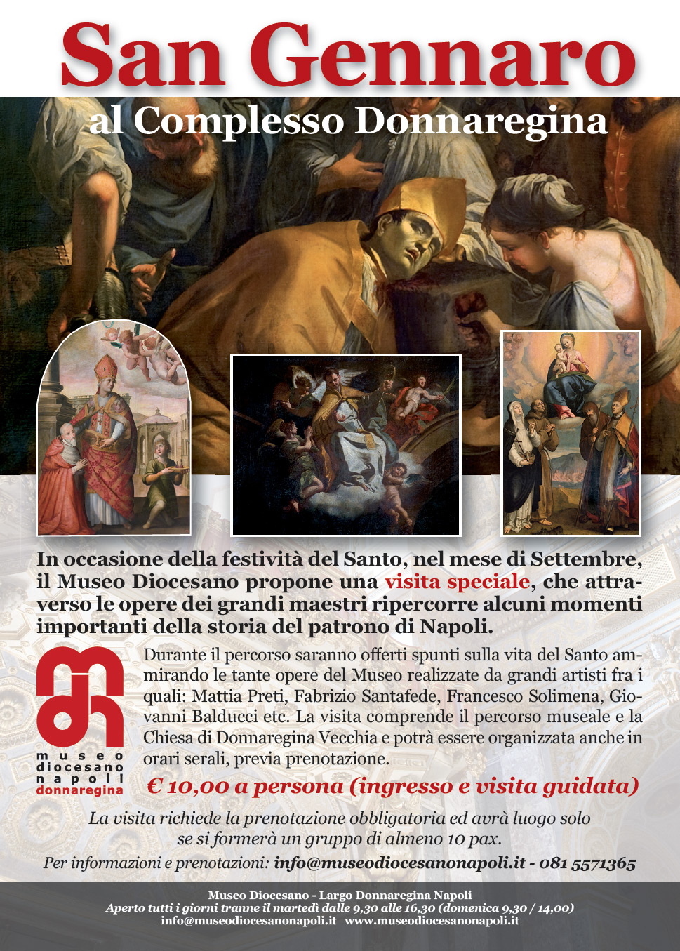 Il Museo Diocesano sorge nel complesso monumentale di Santa Maria Donnaregina Nuova, nel centro storico di Napoli, ed ospita una serie di collezioni artistiche tra cui le rappresentazioni su tela del patrono di Napoli, San Gennaro, che in occasione della festività del 19 settembre saranno protagoniste di una visita speciale: attraverso le opere dei grandi maestri, si ripercorreranno i passaggi fondamentali della storia del Santo. La visita guidata, che comprende anche l’intero percorso museale e la visita al meraviglioso complesso di Donnaregina Vecchia, su prenotazione, potrà essere effettuata anche la sera.