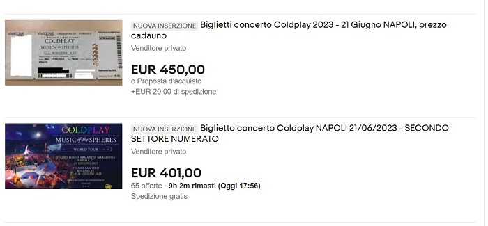 E c’è chi li ha acquistati e li ha rimessi in vendita sulle piattaforme online oppure sui social network. Tanti sono gli annunci su Ebay ad esempio o su Twitter: “Per chi è interessato, vendo due biglietti 1 settore per la data del 28 giugno a San Siro” o “VENDO BIGLIETTI COLDPLAY MILANO 28/06/2023 per inutilizzo“.
