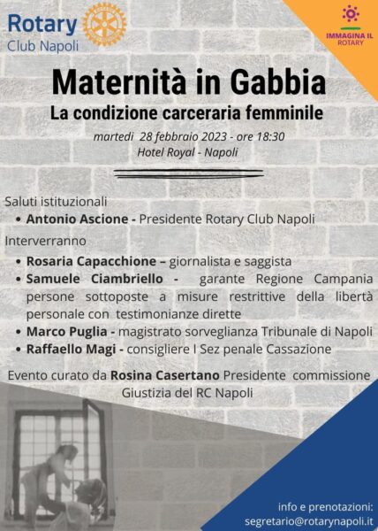 Maternità in gabbia è un evento curato da Rosina Casertano, avvocato cassazionista e presidente commissione giustizia Rotary Napoli. Si terrà domani martedì 28 febbraio alle ore 18.30 all’Hotel Royal.