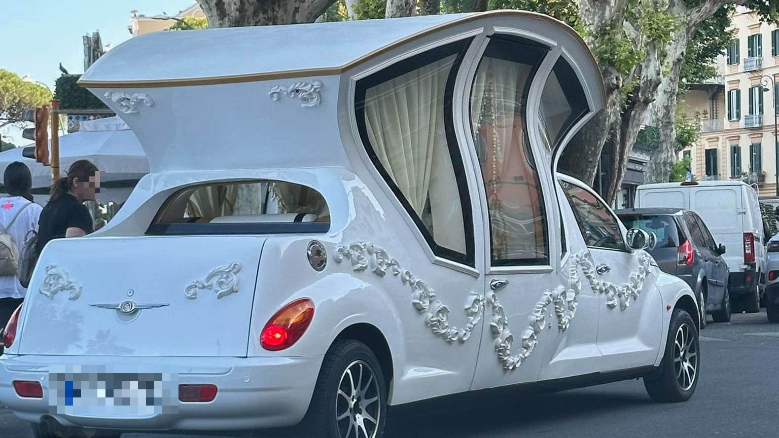 Sembra un’auto uscita da un film d’animazione, per le sue linee curve e bombate, o una carrozza tipo Cenerentola ma con motore e ruote gommate. C’è anche chi vede molte somiglianze con un carro funebre, ma di colore bianco. Qualunque sia l’accostamento, l’automobile è estremamente reale ed è stata fotografata a Napoli, a Mergellina. Si tratta di un’auto nuziale la cui forma è stata appositamente ideata per consentire agli sposi di uscirvi in piedi, in modo da potere essere ammirati in tutta la loro bellezza da invitati ed astanti pronti ad applaudire.