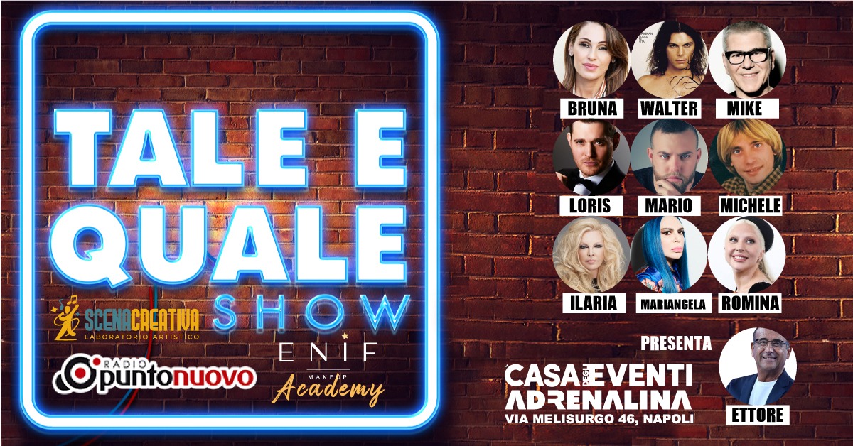 Adrenalina dedica una serata al celebre format televisivo ”Tale e Quale Show” Domenica 13 Ottobre ore 21 per la prima puntata della stagione. Carlo Conti, interpretato da Mr Ettore, condurrà 9 concorrenti che si esibiranno con una canzone del personaggio scelto. Walter, Mike, Romina, Mariangela, Mario, Michele, Ilaria, Bruna e Loris rispettivamente interpreteranno Grignani, Zarrillo, Lady Gaga, Loredana Bertè, Anthony, Nino D’Angelo, Patty Pravo, Anna Tatangelo e Bublè. Make up a cura di Enif Academy Ci sarà una giuria composta da un mix di 3 esperti e partner di Adrenalina e Radio Punto Nuovo (51% di incidenza nelle votazioni) ed il pubblico della serata inciderà il 49% restante. I giurati sono Francesca Grassi, Mario Nigliato e Lady Rose.
