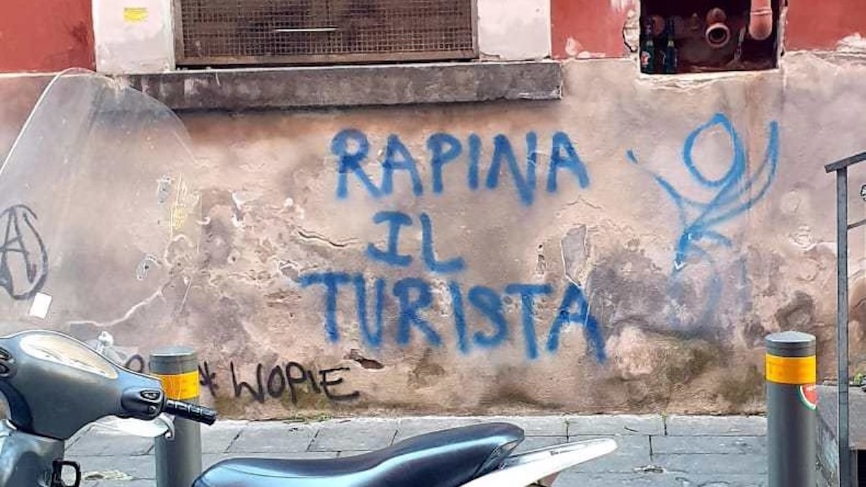 Qualcuno però ha tagliato la testa al toro e ha deciso di esprimere senza mezzi termini la propria opinione: “Rapina il turista”. Così recita una scritta realizzata con vernice spray blu su un muro di Via Tarsia, la strada che collega Montesanto a Piazza Dante.