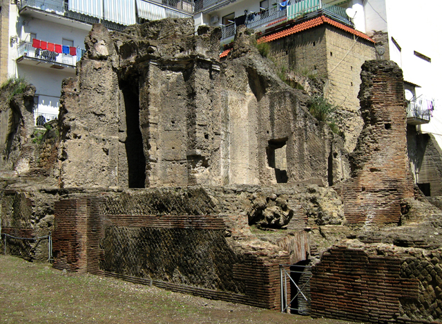 L’edificio religioso romano che inglobava in sé i resti di una fondazione di una domus tardo-repubblicana, si estendeva per circa 700 mq con circa 18 ambienti; è stato edificato alla fine del I sec. d.C. ed è articolato in 2 piani presentando delle volte a crociera e archi in laterizio con delle specchiature in opera reticolata di tufo giallo. Il piano inferiore era destinato ad ambienti di servizio disposti tutt’intorno a una grande sala rettangolare affrescata; nei seminterrati invece erano presenti stanze adibite a magazzini di deposito. Nata come una grande casa privata in età imperiale, dopo il terremoto del 62 e l’eruzione del 79 d.C., fu poi convertita in grande complesso termale, il cui ambiente è riconoscibile verso Sud. Al piano superiore è inoltre visibile una grande vasca rettangolare ricoperta in cocciopesto (materiale usato dagli antichi Romani per pavimenti a contatto con l’acqua per le sue caratteristiche impermeabili. Da Vitruvio veniva chiamato anche Opus signinum – ndr) e una vasca più piccola centrale con gradini e fontana rivestita di marmo bianco.