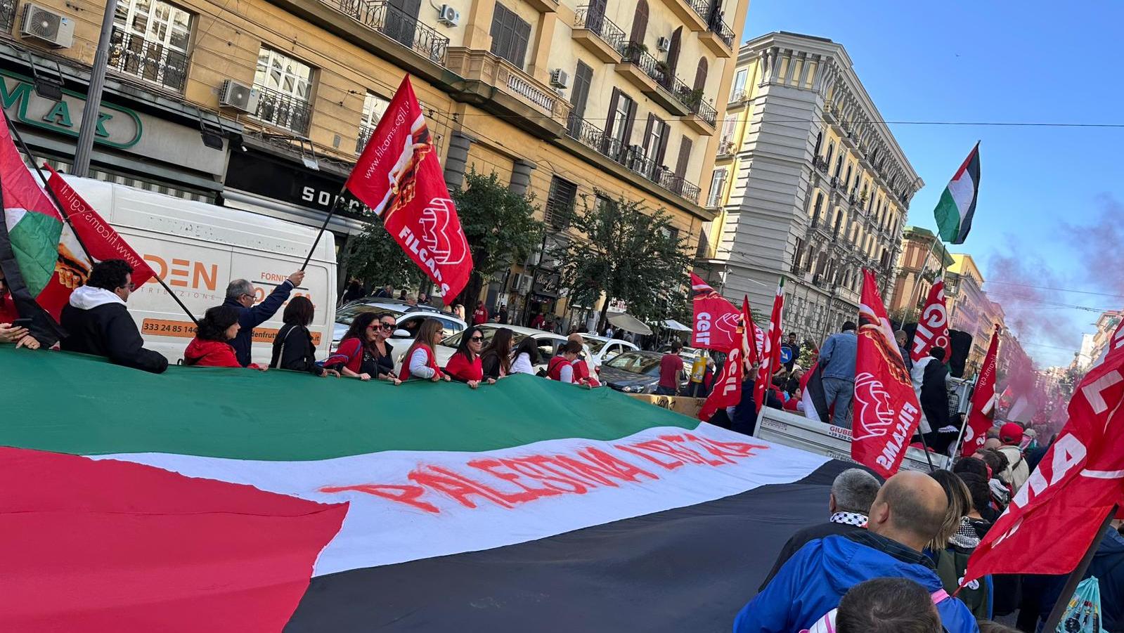 La manifestazione, partita alle ore 9.30 da piazza Garibaldi per dirigersi verso il Rettifilo e poi al porto cittadino sta colorando, in queste ore, le strade di bandiere palestinesi, cartelli, canti e slogan che hanno trasformato il centro cittadino in un fiume di voci unite.