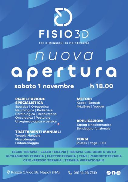 Sabato 1° novembre alle ore 18:00 apre ufficialmente FISIO 3D, un innovativo centro di fisioterapia situato in Piazza G. Vico 58 a Napoli. Un progetto nato dal desiderio di tre giovani professionisti – Daniele Di Nunzio, Davide Donnarumma e Riccardo Di Cosmo – di modernizzare il concetto di fisioterapia e portare nel quartiere un punto di riferimento all’avanguardia per il benessere e la riabilitazione.