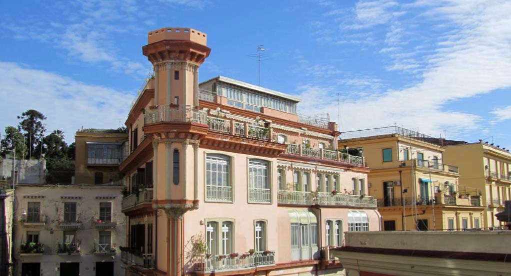 Il primo esempio di questo nuovo stile nella città partenopea è la palazzina Velardi. Costruita dall’architetto Francesco De Simone nel 1906, è situata nel rione Amedeo. In cima alle rampe Brancaccio si trova l’ingresso della struttura, al di sopra del quale, l’edificio si eleva per cinque piani. In realtà a causa del dislivello del suolo, la palazzina presenta cinque piani solo sul prospetto a sud, mentre ne ha quattro sulla facciata opposta. La costruzione possiede circa cento finestre, bifore e trifore, che prima dei bombardamenti aerei del 1943, mostravano una decorazione a stucco su fondo scuro. Elemento di spicco è il torrino, situato nell’angolo dell’ultimo piano, che si erge su via dei Mille.