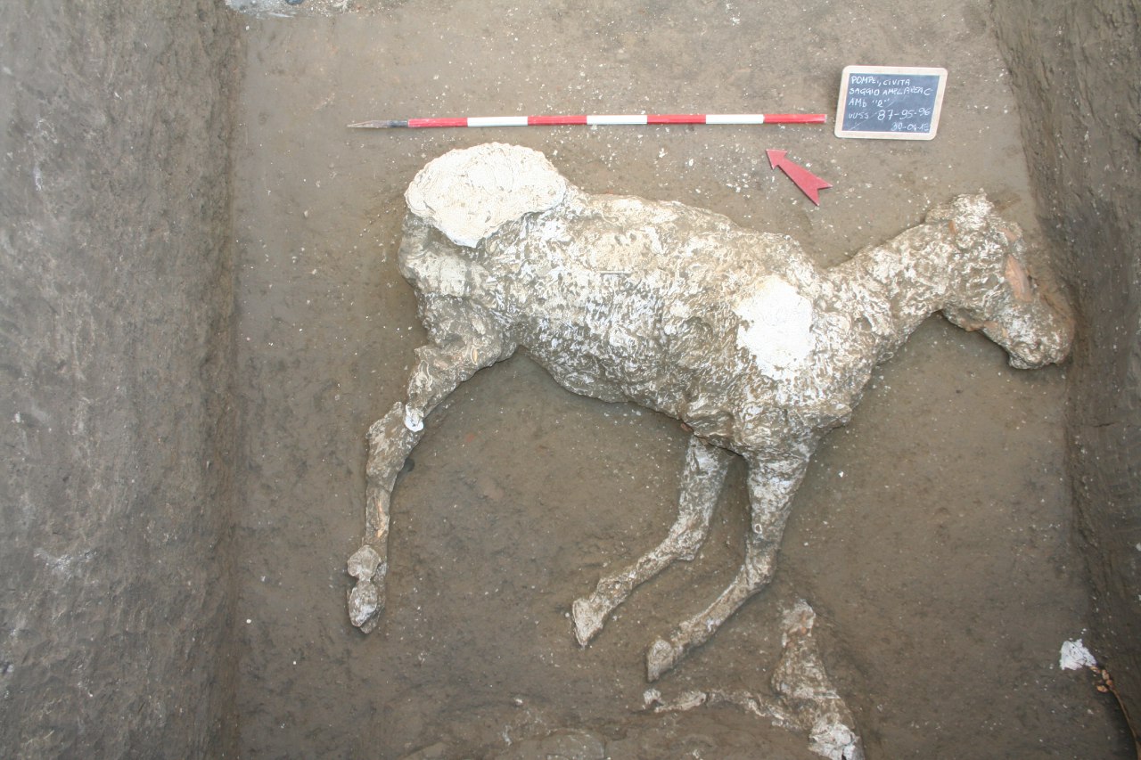 Per la prima volta è stato, inoltre, possibile restituire, attraverso la tecnica dei calchi, la sagoma integra di un cavallo rinvenuto in uno degli ambienti dello scavo di Civita Giuliana. Infatti, tra gli ambienti individuati è emersa una stalla con resti equini. La tecnica dei calchi ha permesso di identificare una mangiatoia la cui struttura, probabilmente costruita in materiale deperibile, è ancora visibile unicamente grazie al calco in gesso.