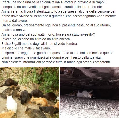 Martedì otto gatti appartenenti ad una colonia felina molto conosciuta a Portici, sono stati trovati morti. La colonia comprendeva 20 gatti e di loro se ne occupava una signora che li accudiva e li aveva persino fatti sterilizzare.