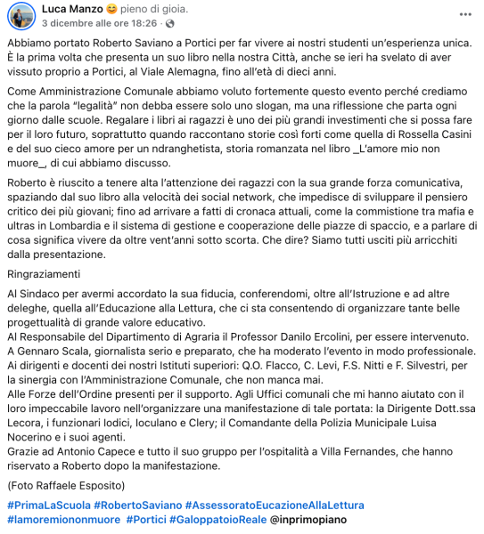 L'amministrazione di Portici acquista oltre 400 volumi del nuovo libro di Saviano