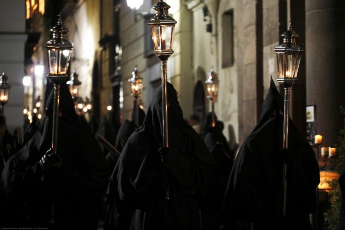 Le processioni della Settimana Santa in penisola Sorrentina sono particolarmente famose e sentite. Questi riti “misterici” ripercorrono la Passione di Cristo e sono stati importati, quasi certamente, dalla Spagna o più precisamente dall’Andalusia. In questa zona della penisola iberica la “Semana Santa” (Settimana Santa), è la ricorrenza più importante dell’anno, anche più di Natale. Tra quelle che si svolgono la più solenne è quella della sera del Venerdì Santo, conosciuta come quella del “Cristo Morto” o “Processione Nera”, organizzata da molti secoli dalla Arciconfraternita della Morte di Sorrento. Viene aperta dalla Banda Musicale alternata tra quelli che portano le funi e i flagelli e quelli che portano i lampioni.