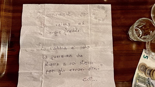Però a bilanciare l’episodio spiacevole ce n’è stato un altro gradito. Un cliente ha lasciato un fazzoletto sul suo tavolo con un messaggio di solidarietà dopo che probabilmente aveva assistito alla scena: “Complimenti per la calma ed il sangue freddo! La rabbia è solo la punizione che diamo a noi stessi per gli errori altrui“.
