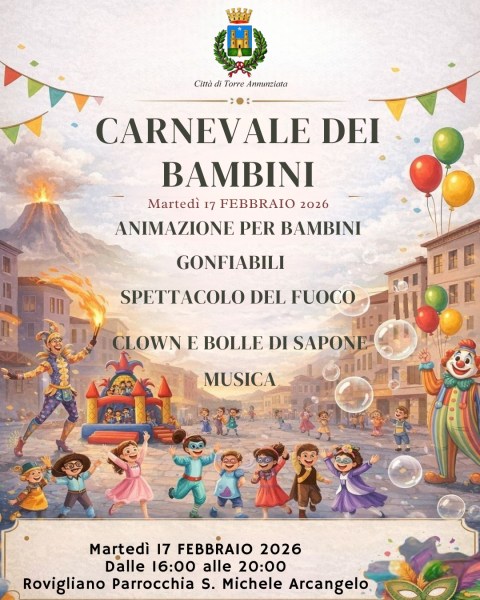 In occasione di Carnevale 2026 previsti due appuntamenti a Torre Annunziata per bambini e famiglie.