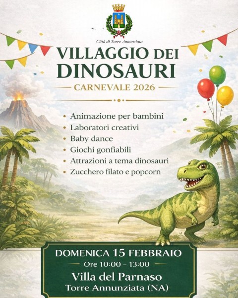Domenica 15 febbraio 2026 in villa Parnaso sarà allestito il villaggio dei dinosauri, dalle 10 alle 13, con animazione, baby dance, trucchi, giochi gonfiabili e attrazioni a tema dinosauri.