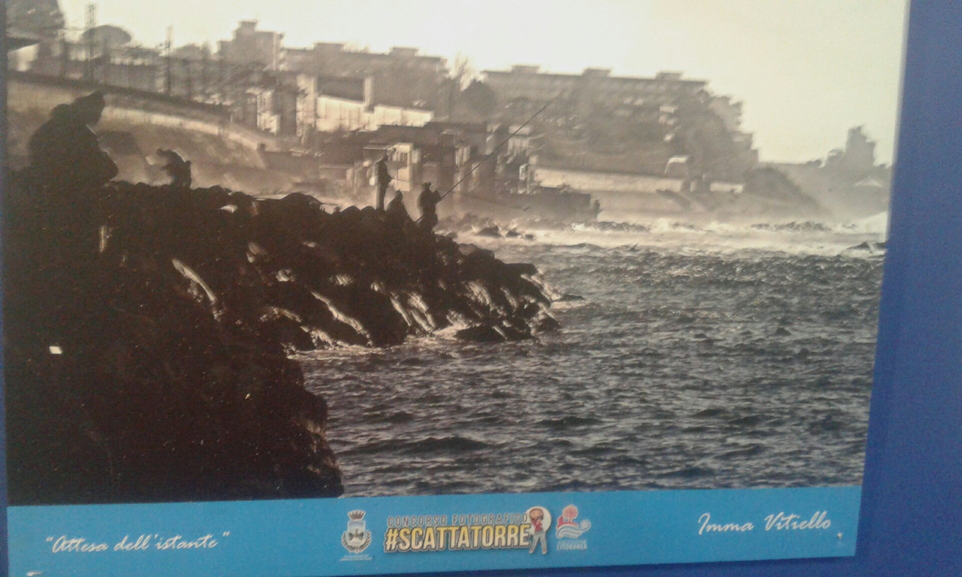 Durante la cerimonia di premiazione tenutasi venerdi 16 dicembre presso l’ex palestra Gil di via V.Veneto, la giuria presieduta dal dott. Mariano Di Micco e composta dal fotografo Lucio Ferrara, dalla presidente de La Libellula, colonna portante dell’associazionismo torrese dedita alla salvaguardia dei diritti di anziani e disabili, dalla giornalista Luisa Panariello e dalla rappresentante Atom (Associazione Malati e Trapiantamri d’organi) Patrizia Annoso, ha selezionato, tra le tre foto che hanno fatto il pieno di likes, l’istantanea “Attesa dell’istante” di Imma Vitiello, panoramica di un angolo di litorale che immortala un gruppo di pescatori in paziente immobilità immersi nel loro quotidiano scrutare il mare. A mitigare l’essenzialità dello scatto, il timido occhieggiare della bellissima Torre di Bassano, sullo sfondo.
